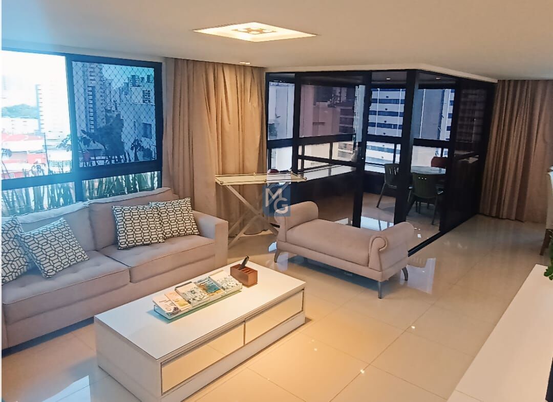 O APARTAMENTO: Varanda, Sala para 03 ambientes, 04 quartos sendo 02 Suítes, 02 WC (01 Social e 01 Serviço), Corredor, Copa, Cozinha, Dependência de Empregada, Despensa, Área de Serviço, 02 Vaga(s) na Garagem. Box no Banheiro, Armário na Cozinha e Quartos